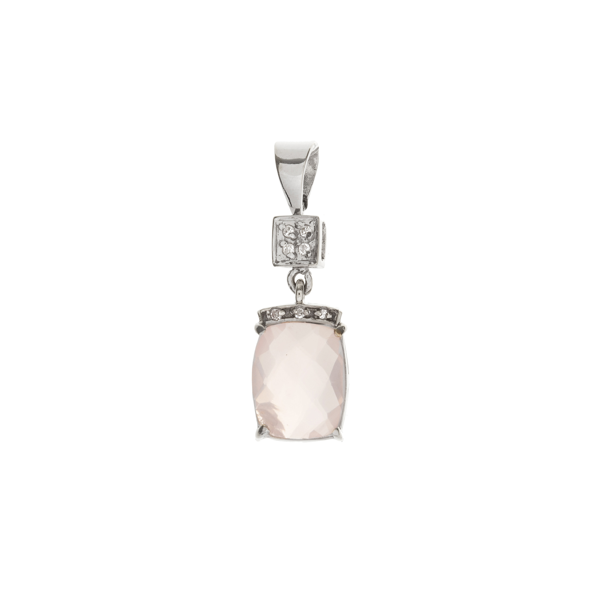 Pingente de ouro branco com quartzo rosa e 0,02ct de brilhantes. Medida 2,5cm.