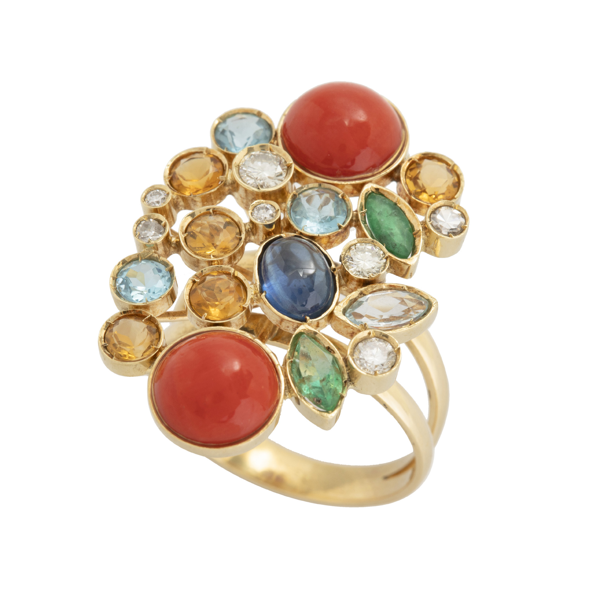 Anel de ouro amarelo com corais, citrinos, topázios azuis, esmeraldas, 0,50ct de brilhantes e 11,8g. Medida 26.