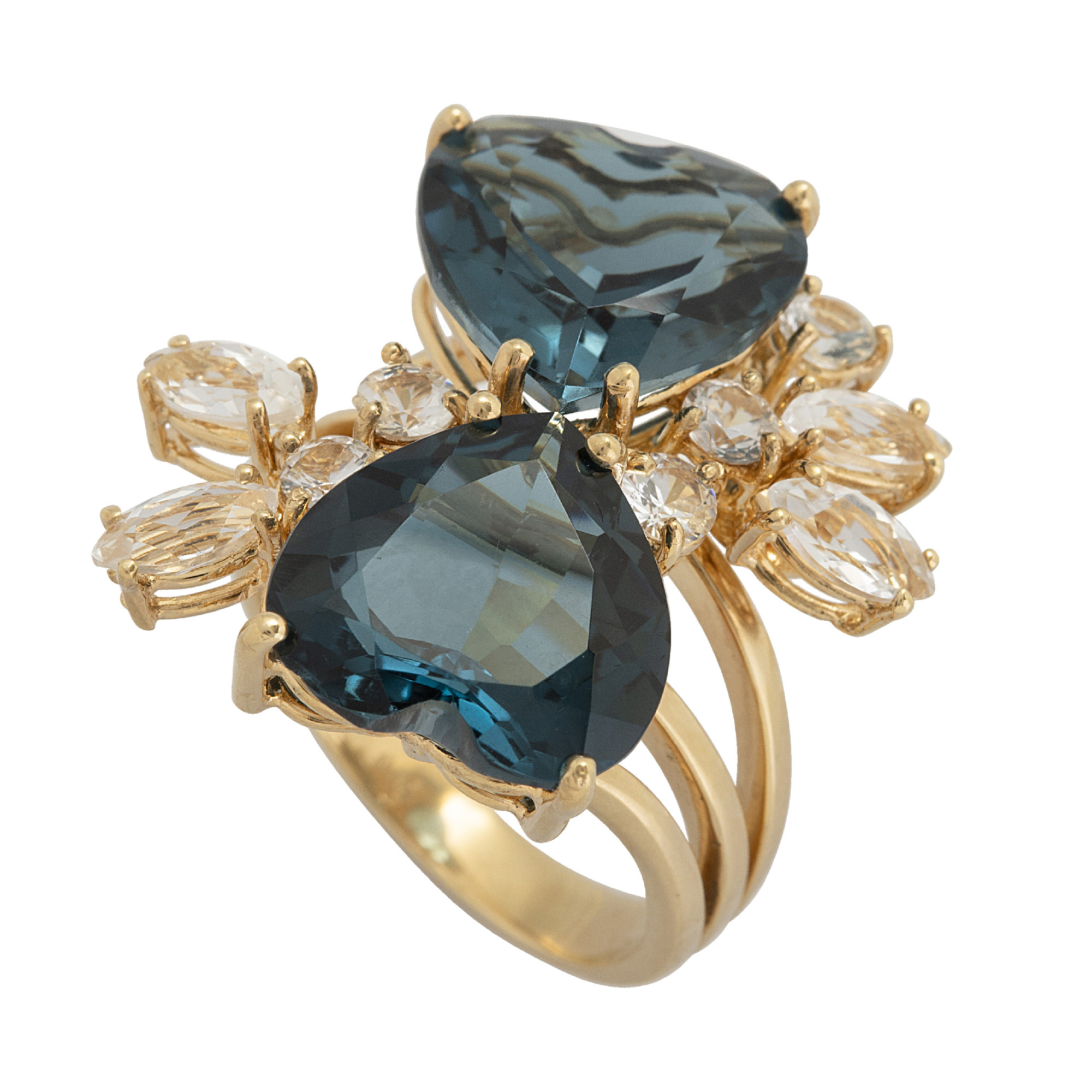 Anel de ouro amarelo com topázios london, safiras brancas e 11,3g. Medida 18.