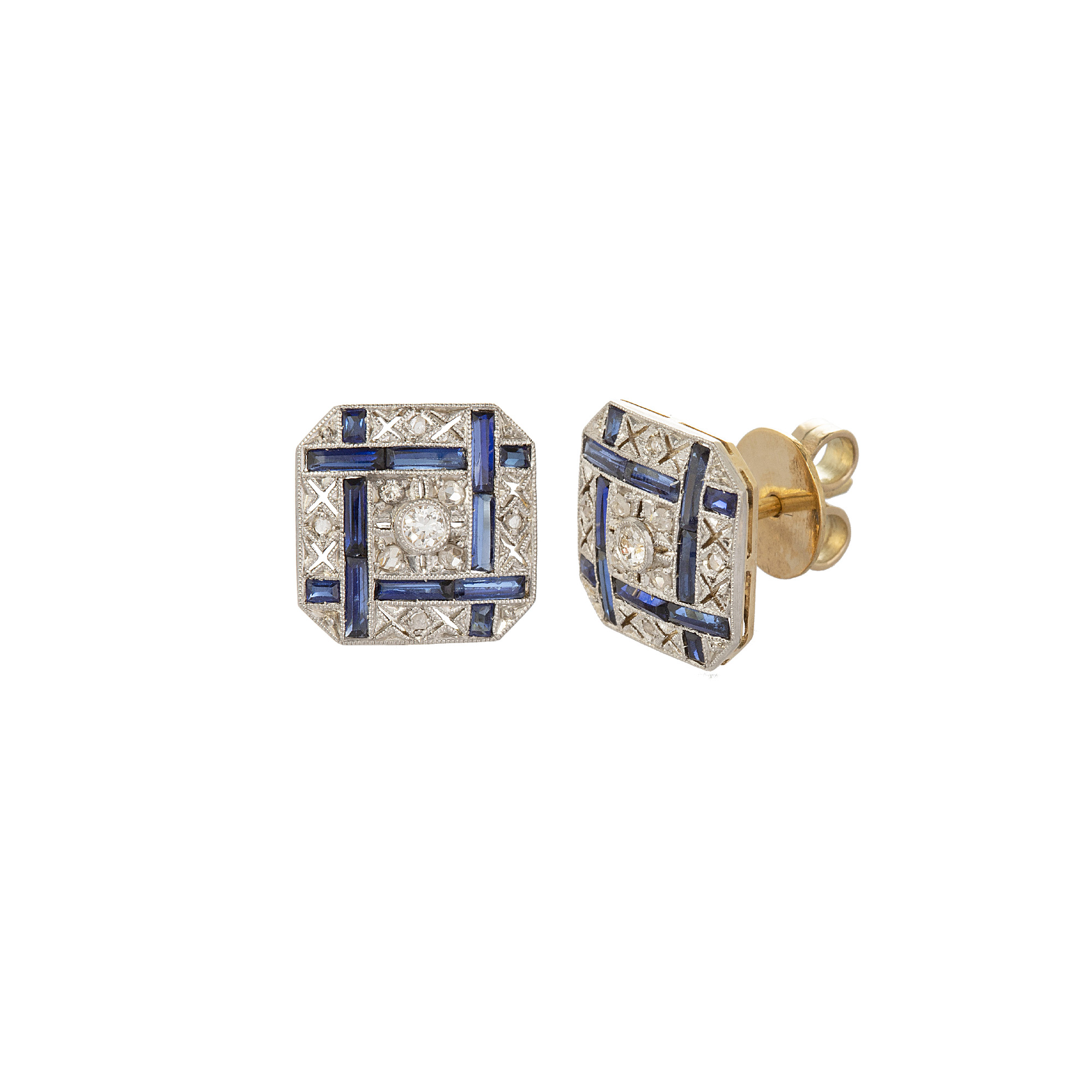 Brinco de ouro amarelo e platina com safiras sintéticas e 0,14ct de brilhantes. Medida 1,2cm.
