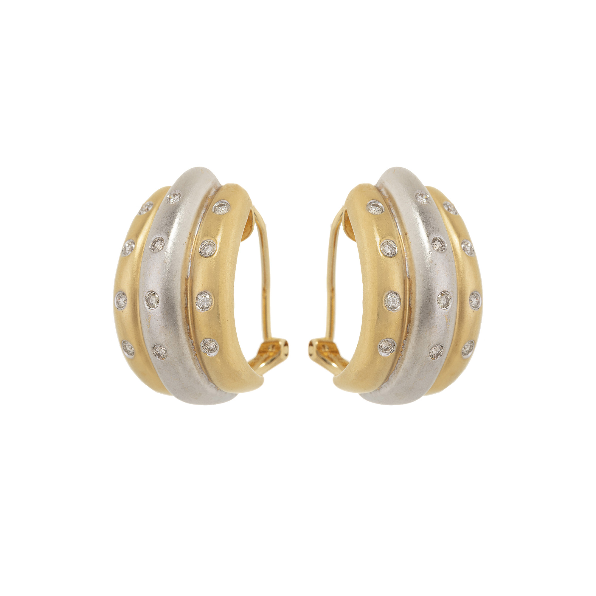 Brinco de ouro amarelo e branco com 0,35ct de brilhantes e 10,6g. Medida 2,3cm.