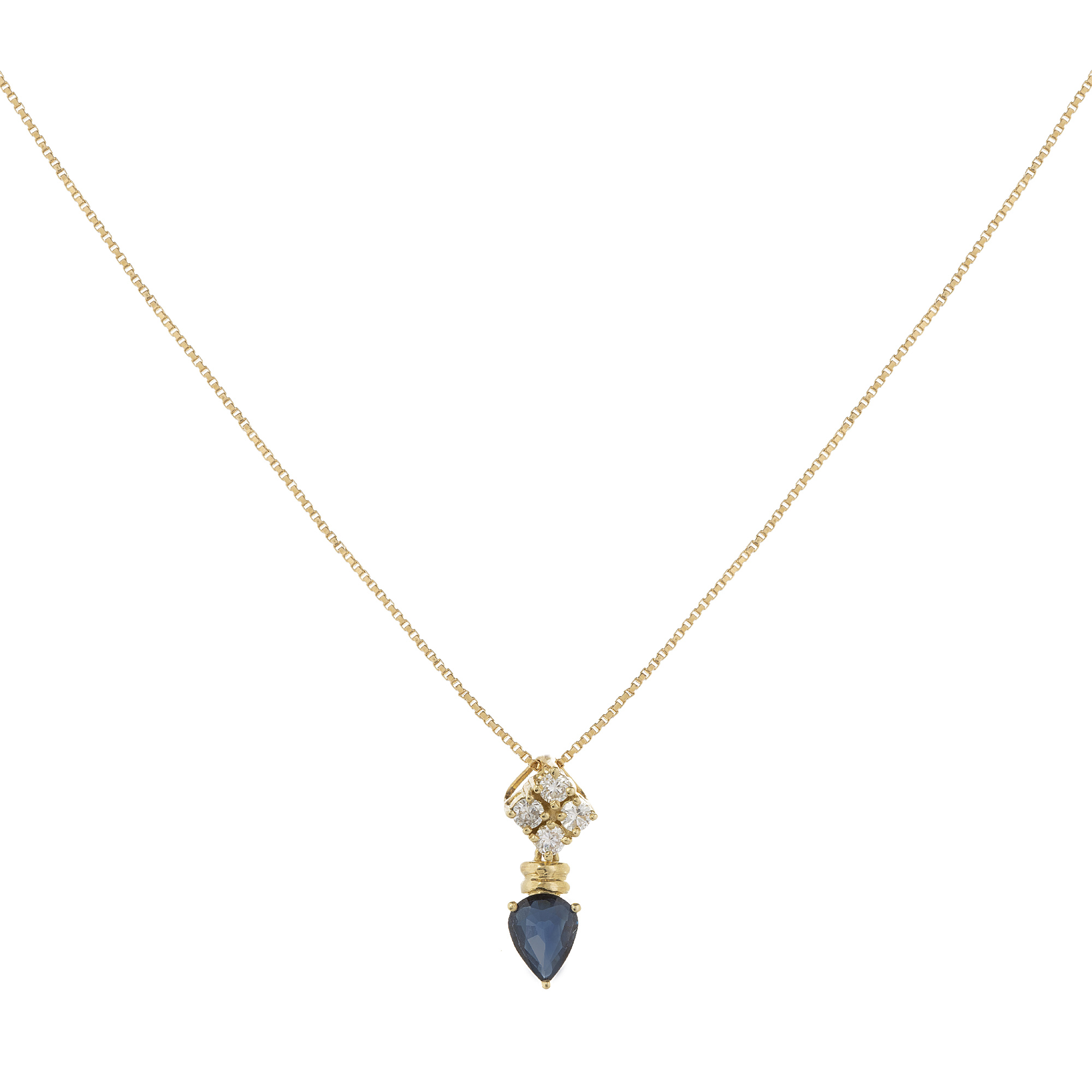 Corrente com pingente de ouro amarelo, safira e 0,30ct de brilhantes. Medidas 1,8cm/40cm.