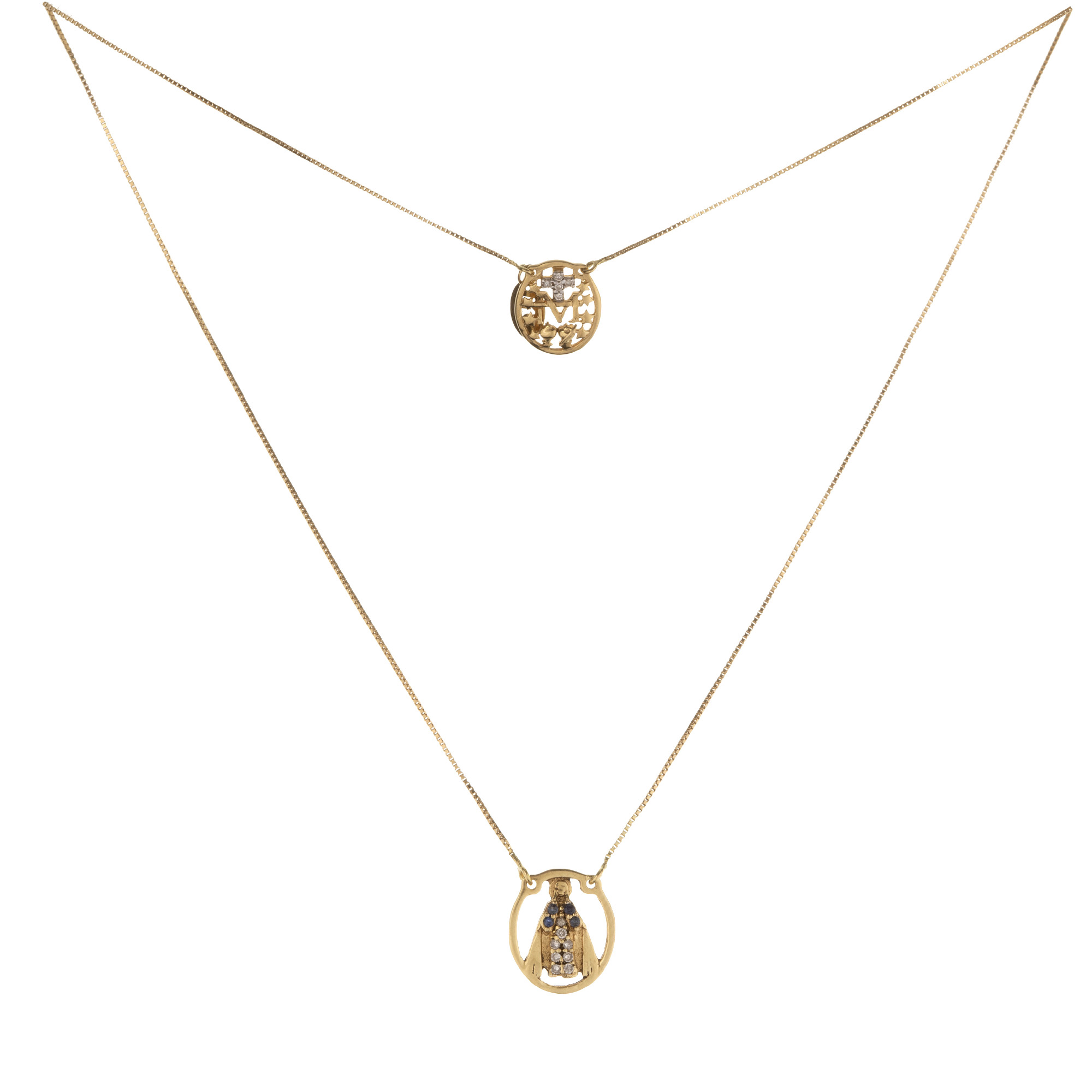 Escapulário de ouro amarelo com safiras e 0,05ct de brilhantes. Medidas 1cm/66cm.