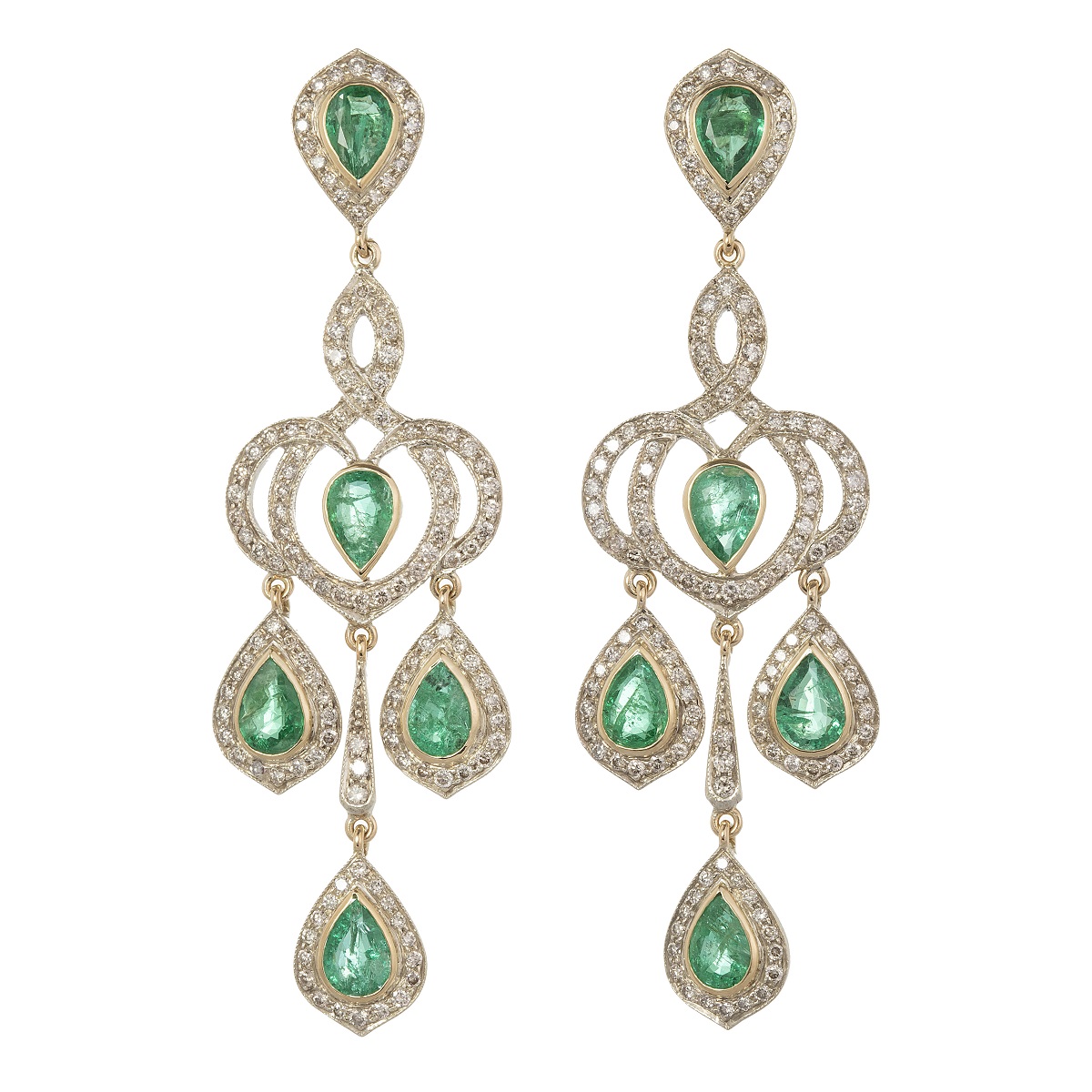 Brinco de ouro amarelo 14k com prata, esmeraldas, 2,40ct de brilhantes e 16,8g. Medida 7,3cm.