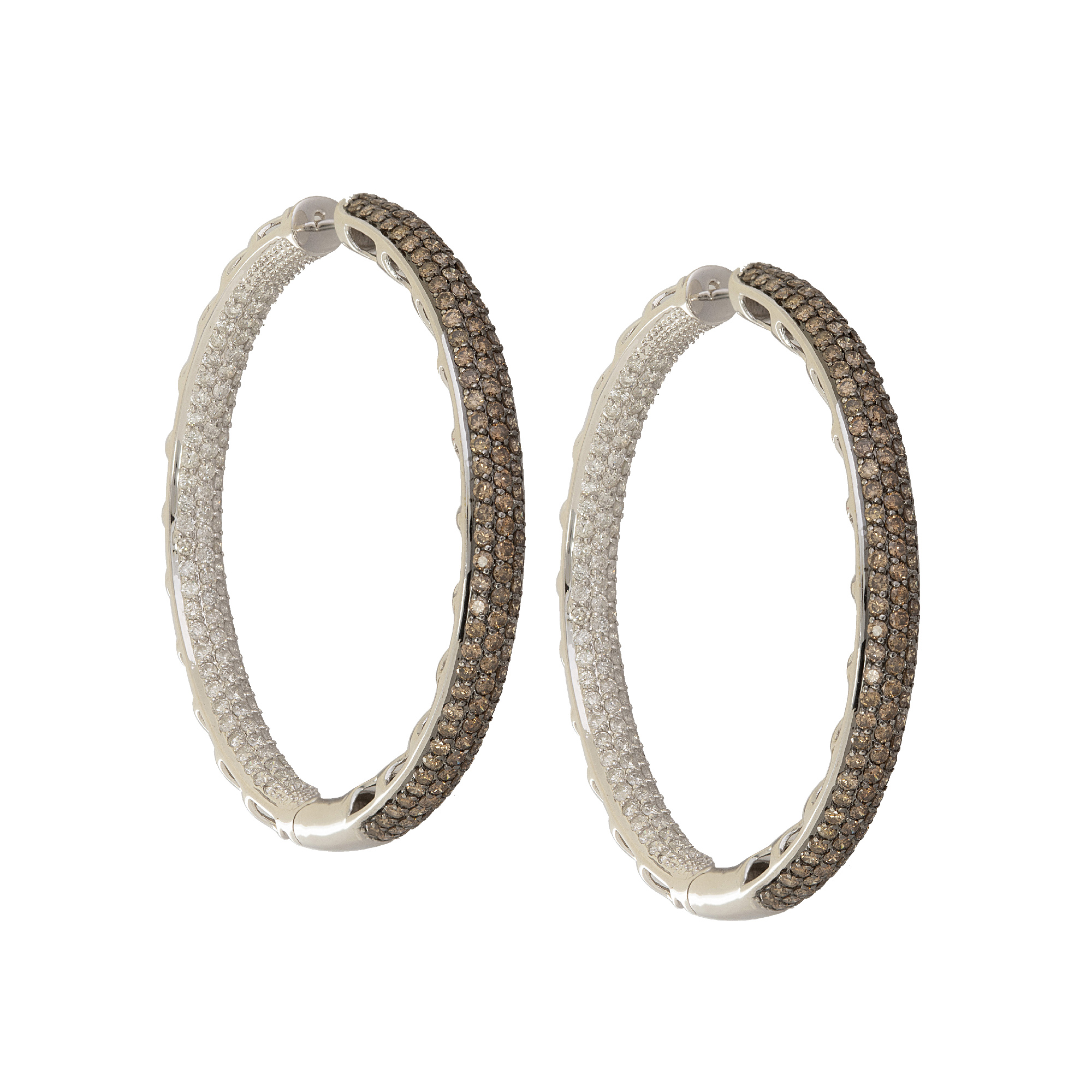 Brinco de ouro branco com 7,00ct de brilhantes (sendo 3,00ct de brilhantes brancos/4,00ct de brilhantes castanhos) e 22,2g. Medida 5cm.