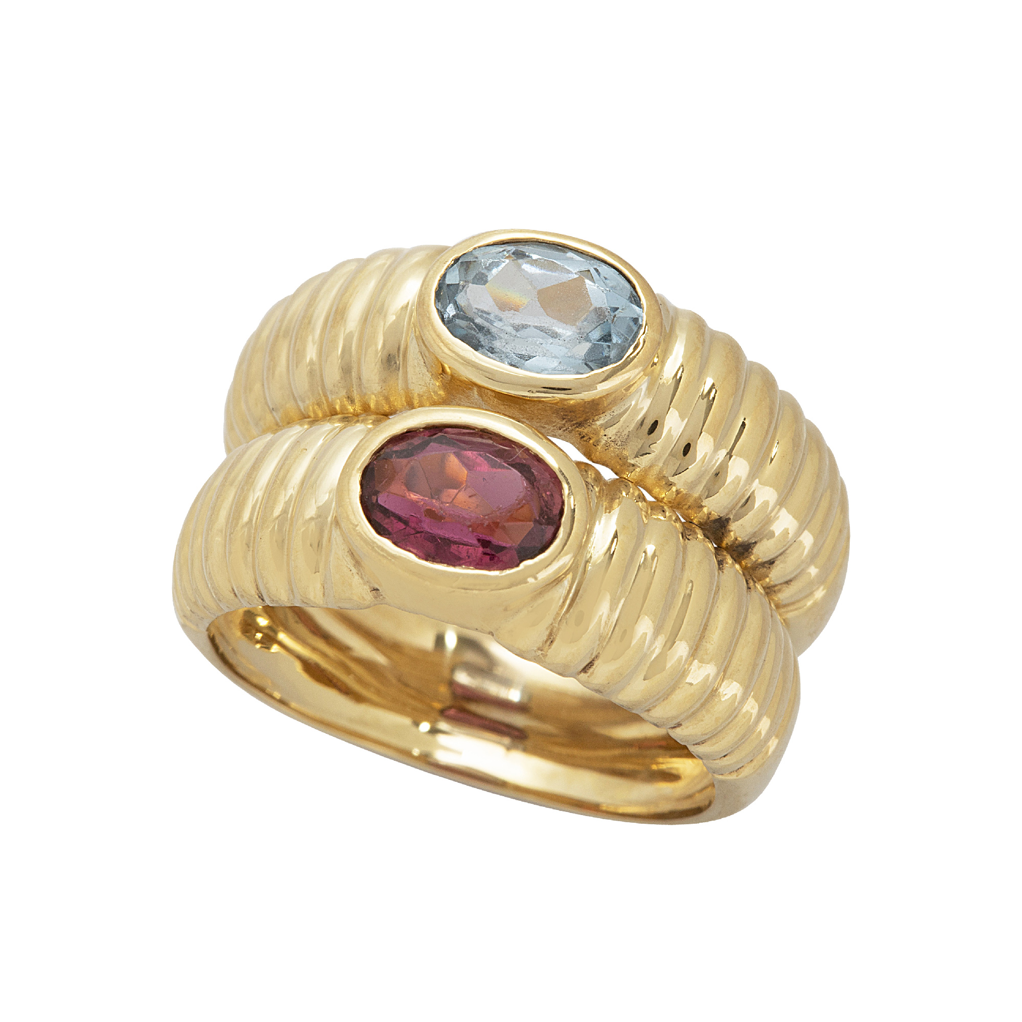 Anel de ouro amarelo com topázio azul, turmalina rosa e 8,3g. Medida 17.