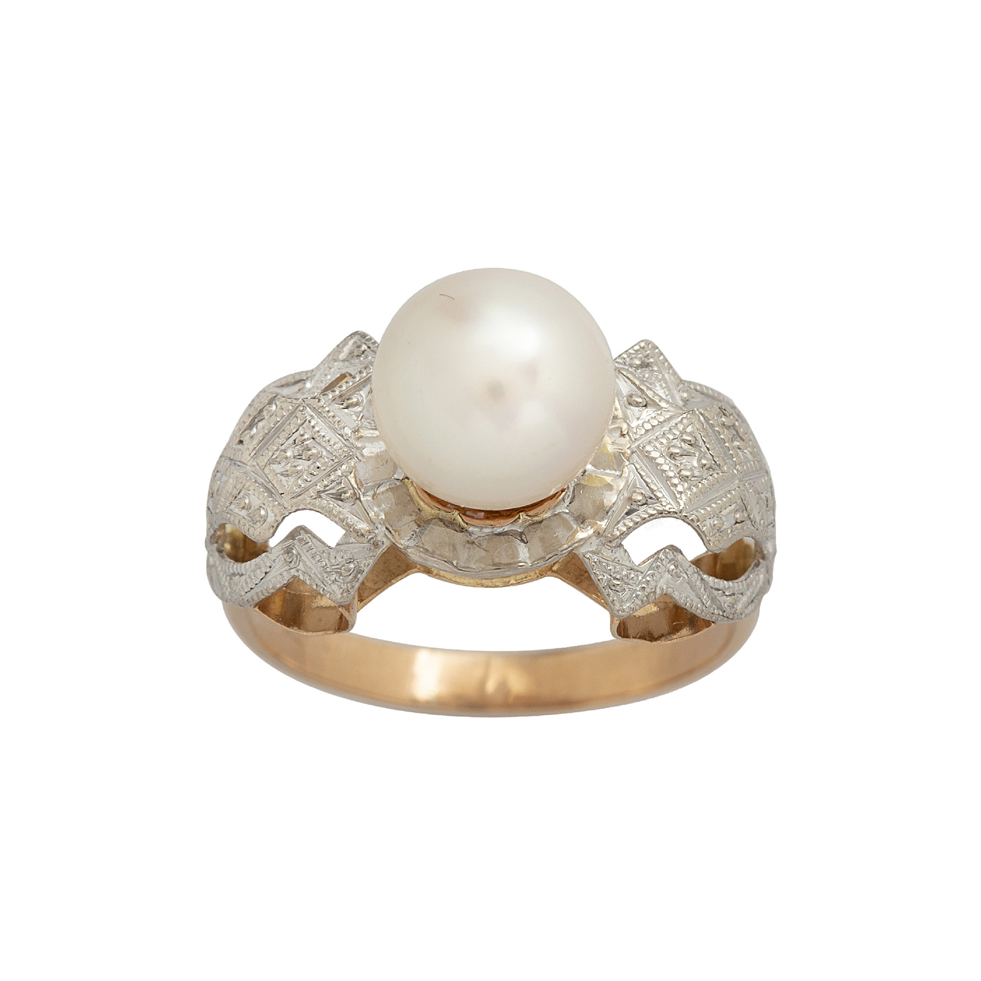 Anel de ouro amarelo com platina e pérola (8mm). Medida 13.