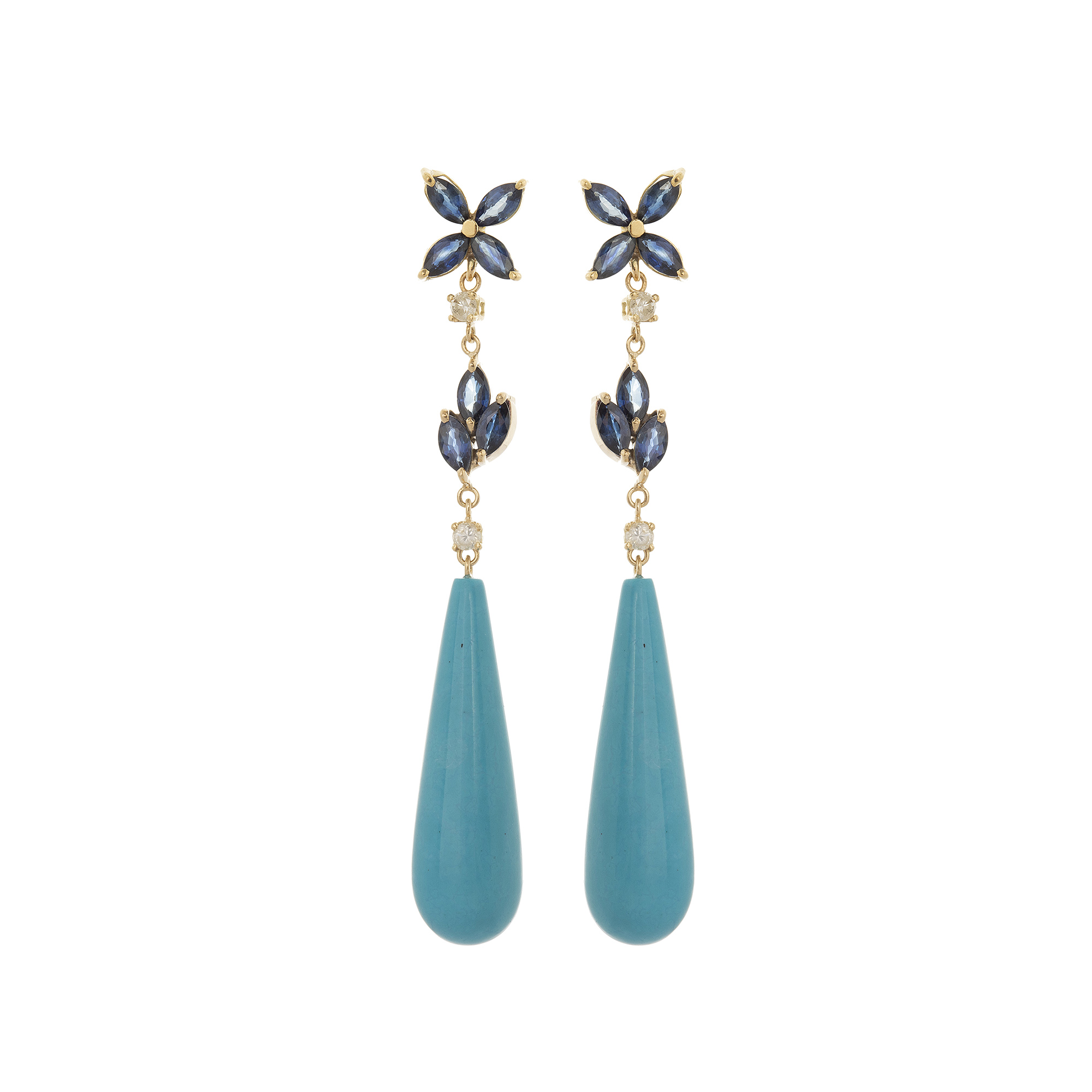 Brinco de ouro amarelo com safiras, turquesas, 0,35ct de brilhantes e 12,4g. Medida 7,5cm.