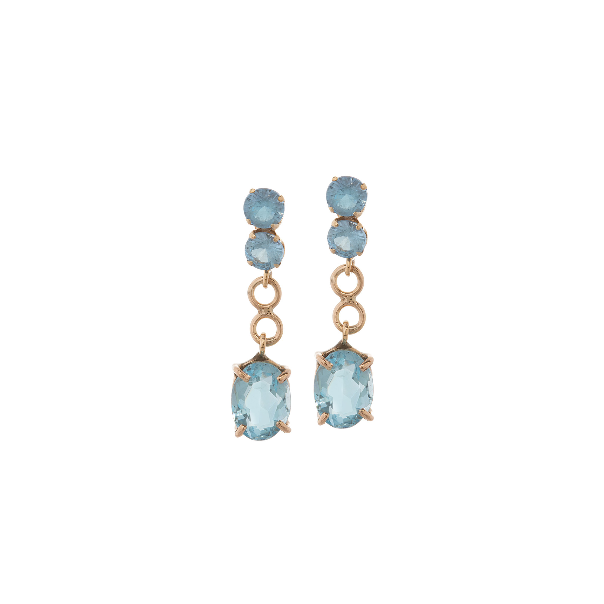 Brinco de ouro amarelo com águas-marinhas e topázios azuis. Medida 2,5cm.