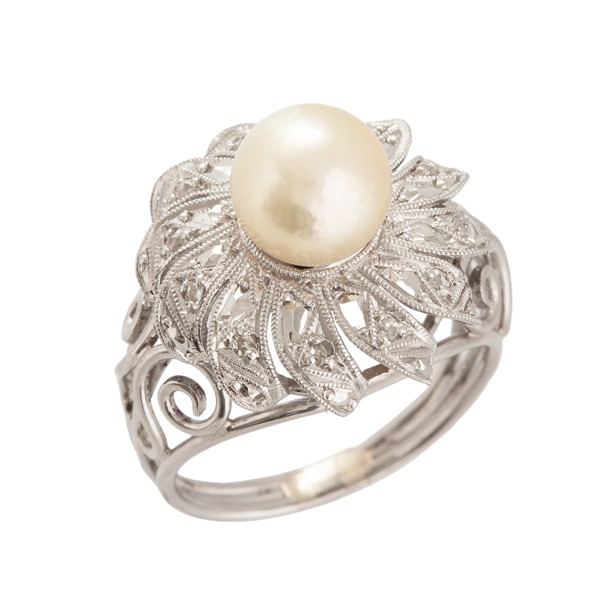 Anel de platina com pérola (8mm), 0,05ct de diamantes lapidação rose cut e 6,2g. Medida 17.