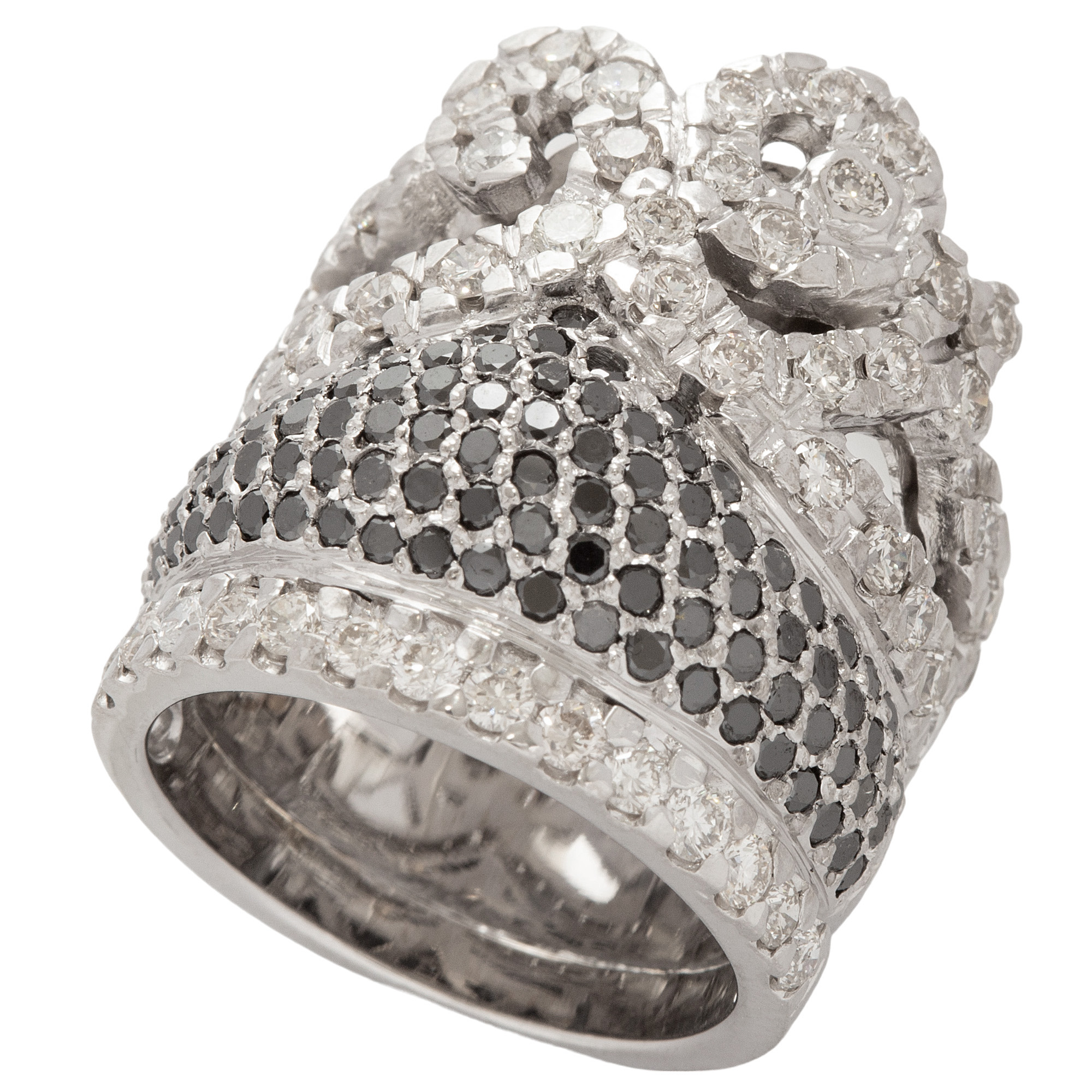 Anel de ouro branco com 2,92ct de brilhantes (sendo 1,17ct de brilhantes negros/1,75ct de brilhantes brancos) e 21,3g. Medida 19.
