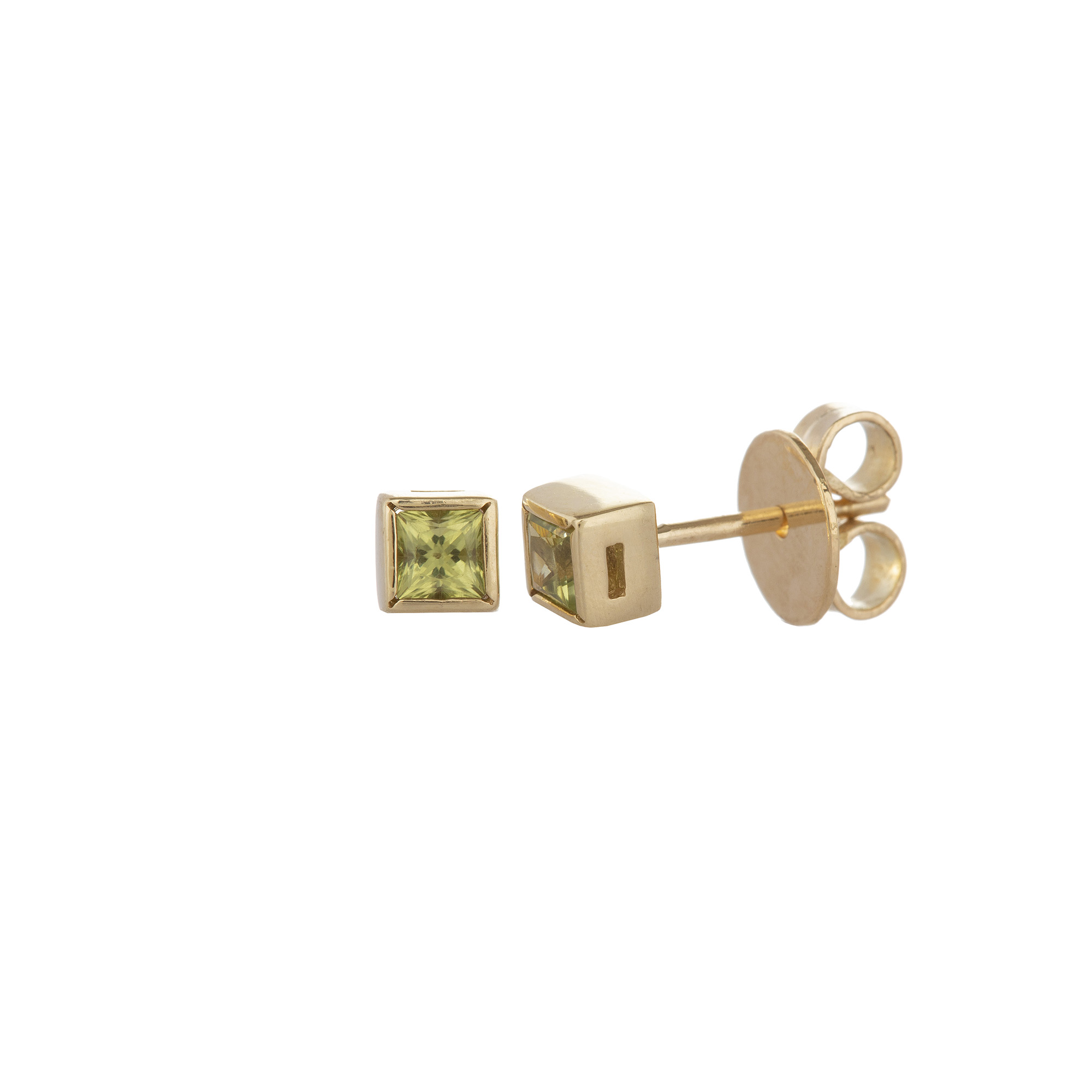 Brinco de ouro amarelo com peridotos. Medida 0,4cm.