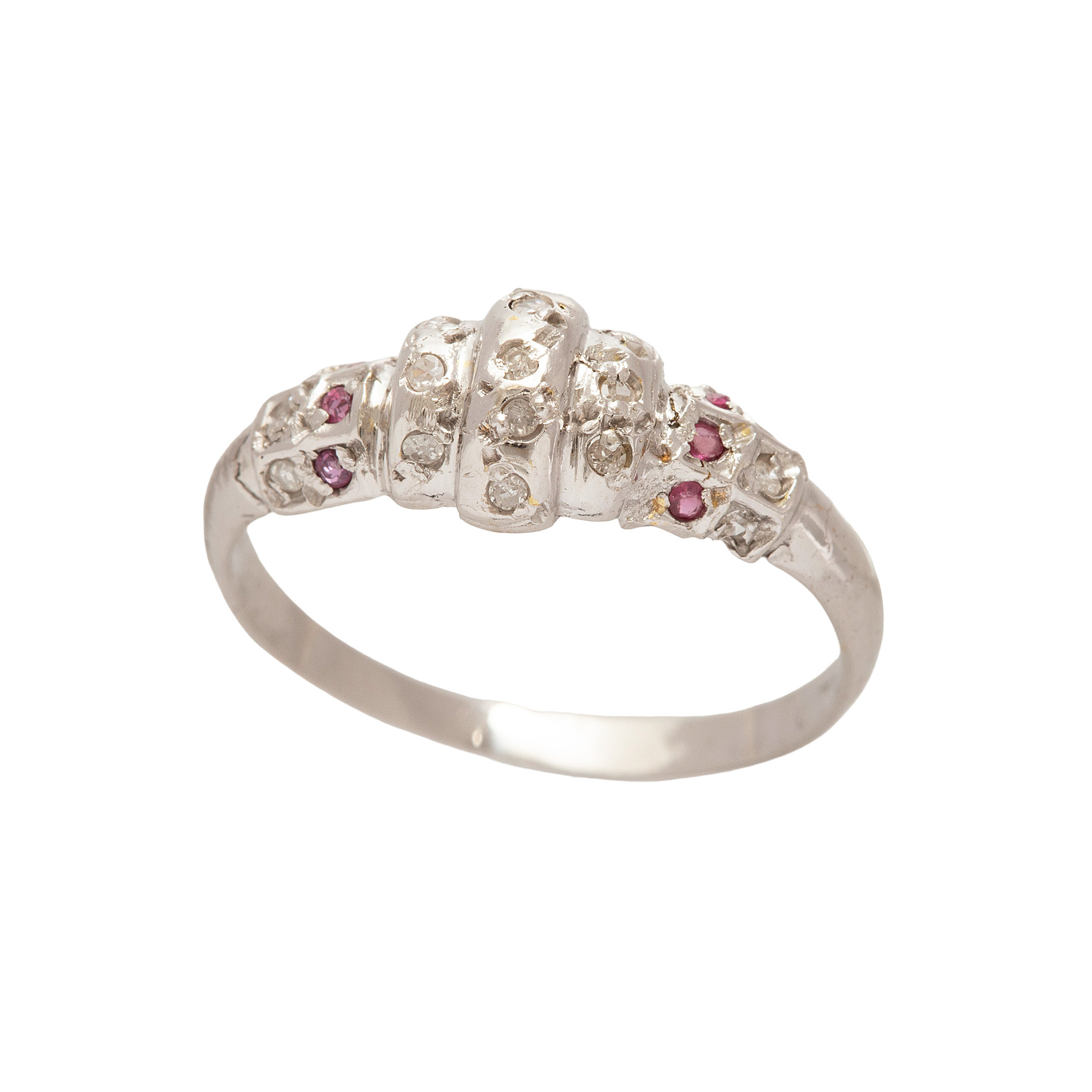 Anel de ouro branco com rubis e 0,06ct de brilhantes. Medida 20.