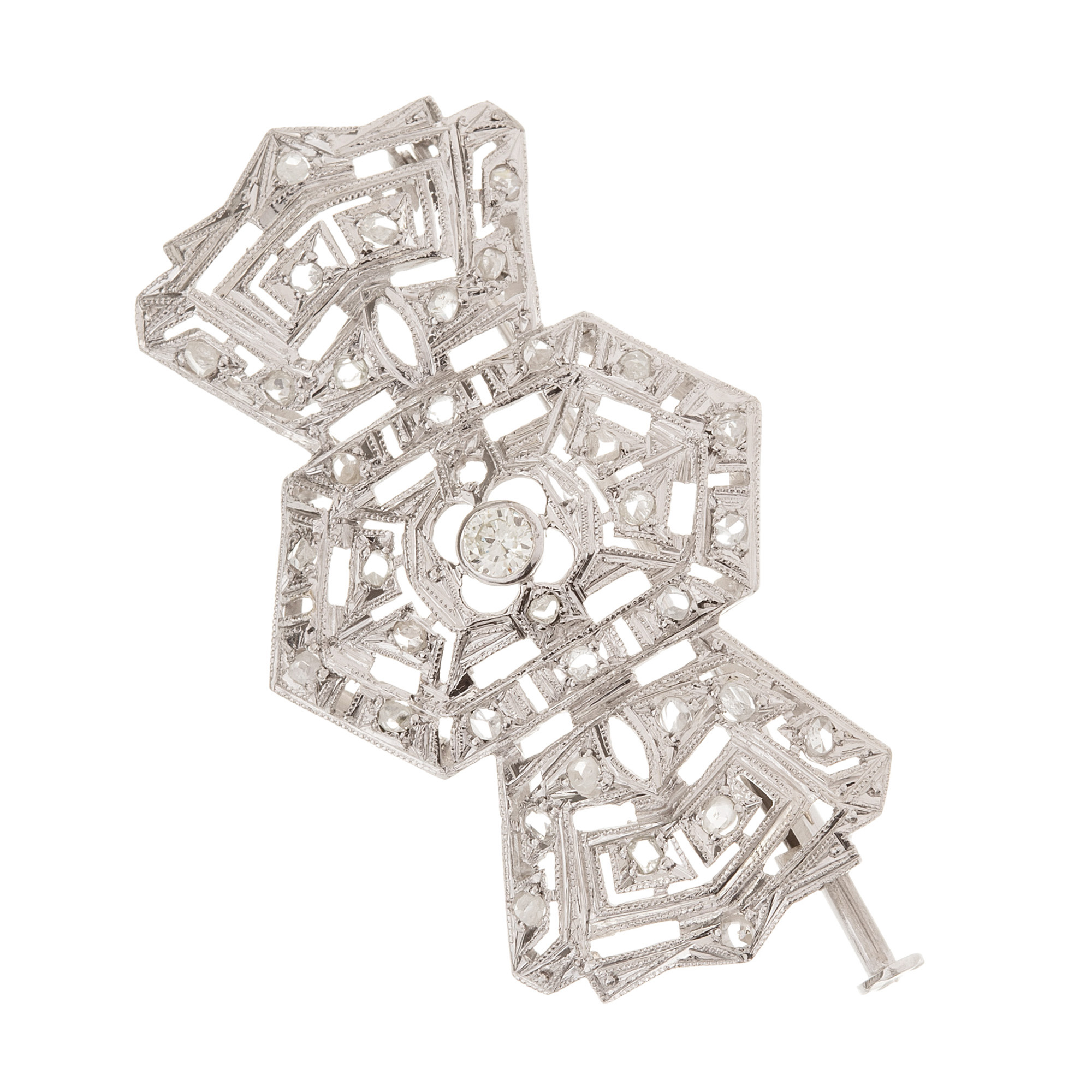 Broche de ouro branco com 0,30ct de diamantes (sendo 0,10ct de lapidação brilhante/0,30ct de lapidação rose cut) e 6,1g. Medida 2,6x4,2cm.