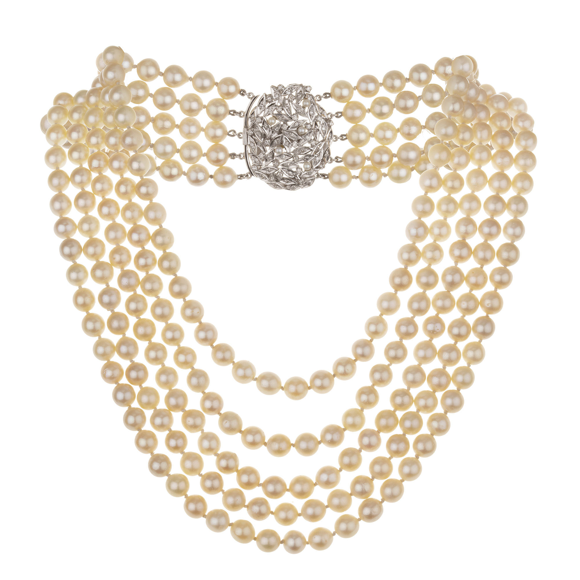 Colar de pérolas (7 a 8mm) com ouro branco 14k e 1,30ct de brilhantes. Medidas 39 a 53cm.