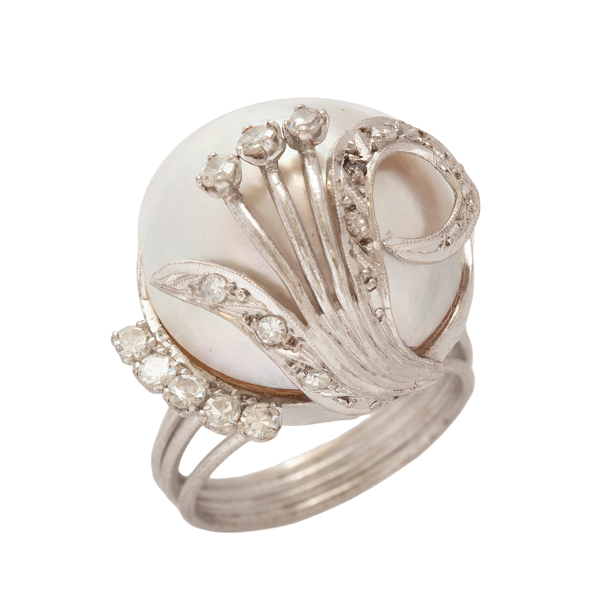 Anel de ouro branco 14k com pérola mabe, 0,50ct de brilhantes e 9,5g. Medida 14.