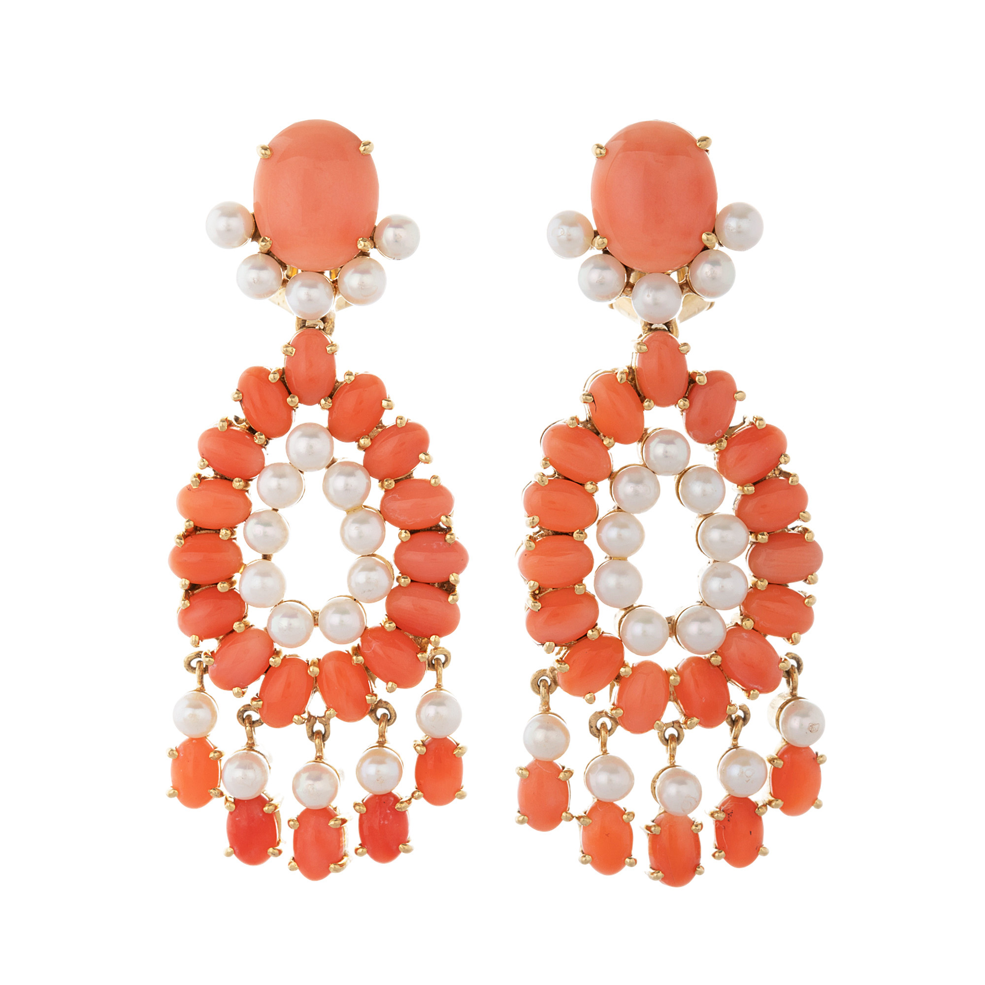 Brinco de ouro amarelo com pérolas (4mm), corais (11,8mm) e 42,3g. Medida 6cm.